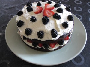 It’s Frank’s birthday! Yay! Ok, it was his birthday a week ago, but we are celebrating tonight with a feast of beer can chicken and other things which I can’t remember at the moment. What’s for dessert you ask? Chocolate cake with mascarpone icing, topped with some berries. Frank is a man who loves dessert, and I hope this cake doesn’t disappoint.